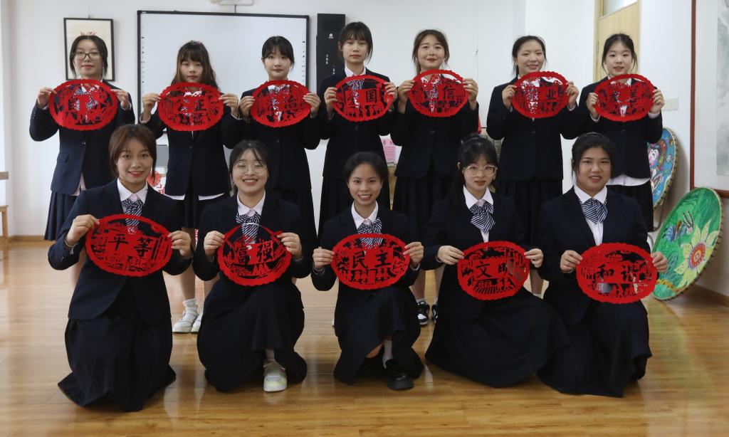 学生在郭靓薇的带领下运用剪纸技术剪出了社会主义核心价值观、剪纸披肩和窗花等各类手工艺术品,学生手法略显生疏但积极性高涨。