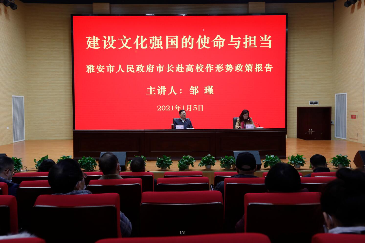 在全院深入开展学习贯彻党的十九届五中全会、省委十一届八次全会和市委四届九次全会精神之际,1月5日上午,雅安市市长邹瑾来到我院作形势政策报告,勉励师生要增强传承文化的使命意识与担当精神,增强文化自信,坚定理想信念,聚焦远景目标,书写时代华丽篇章。学院院长石静主持报告会。