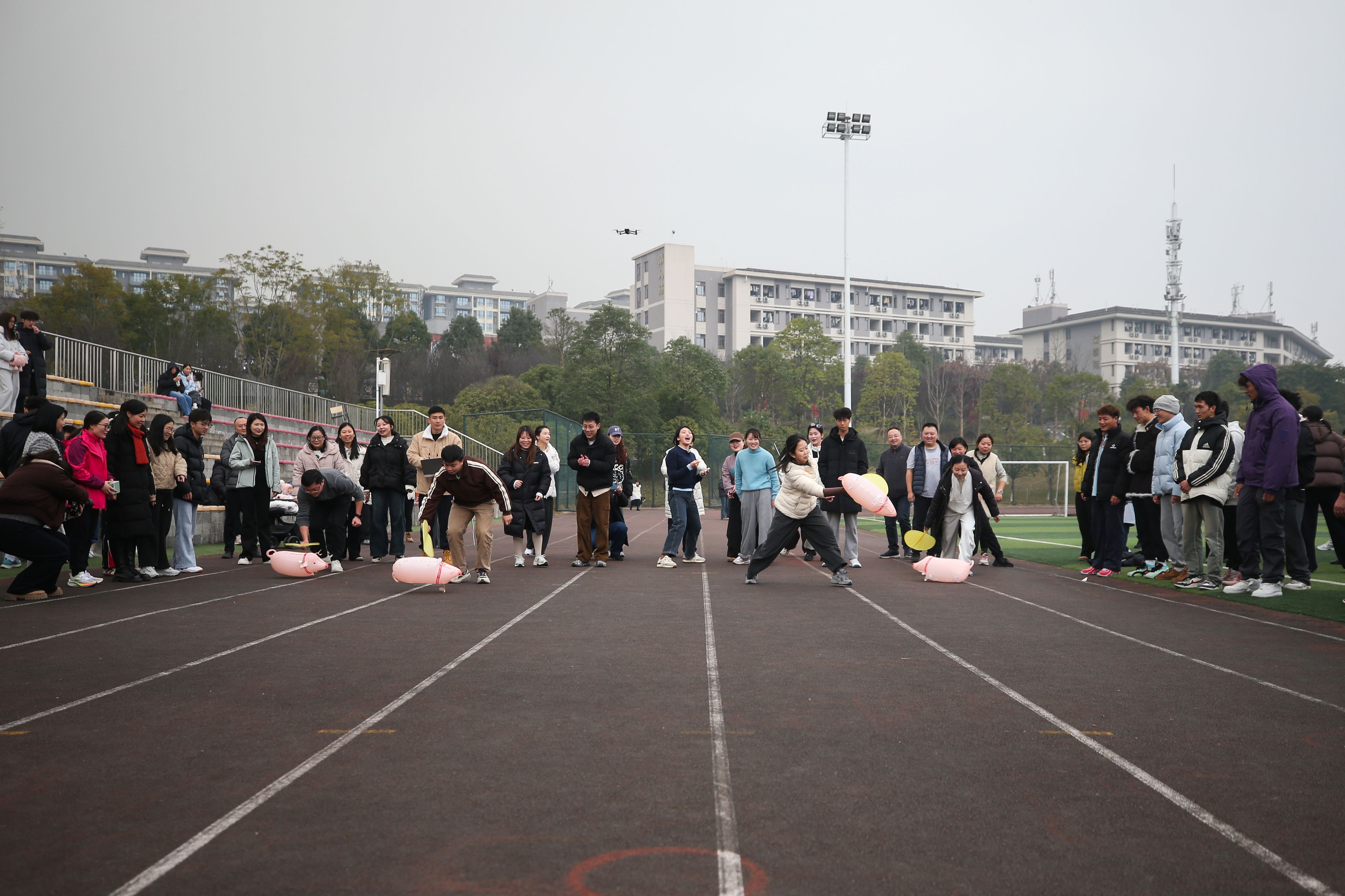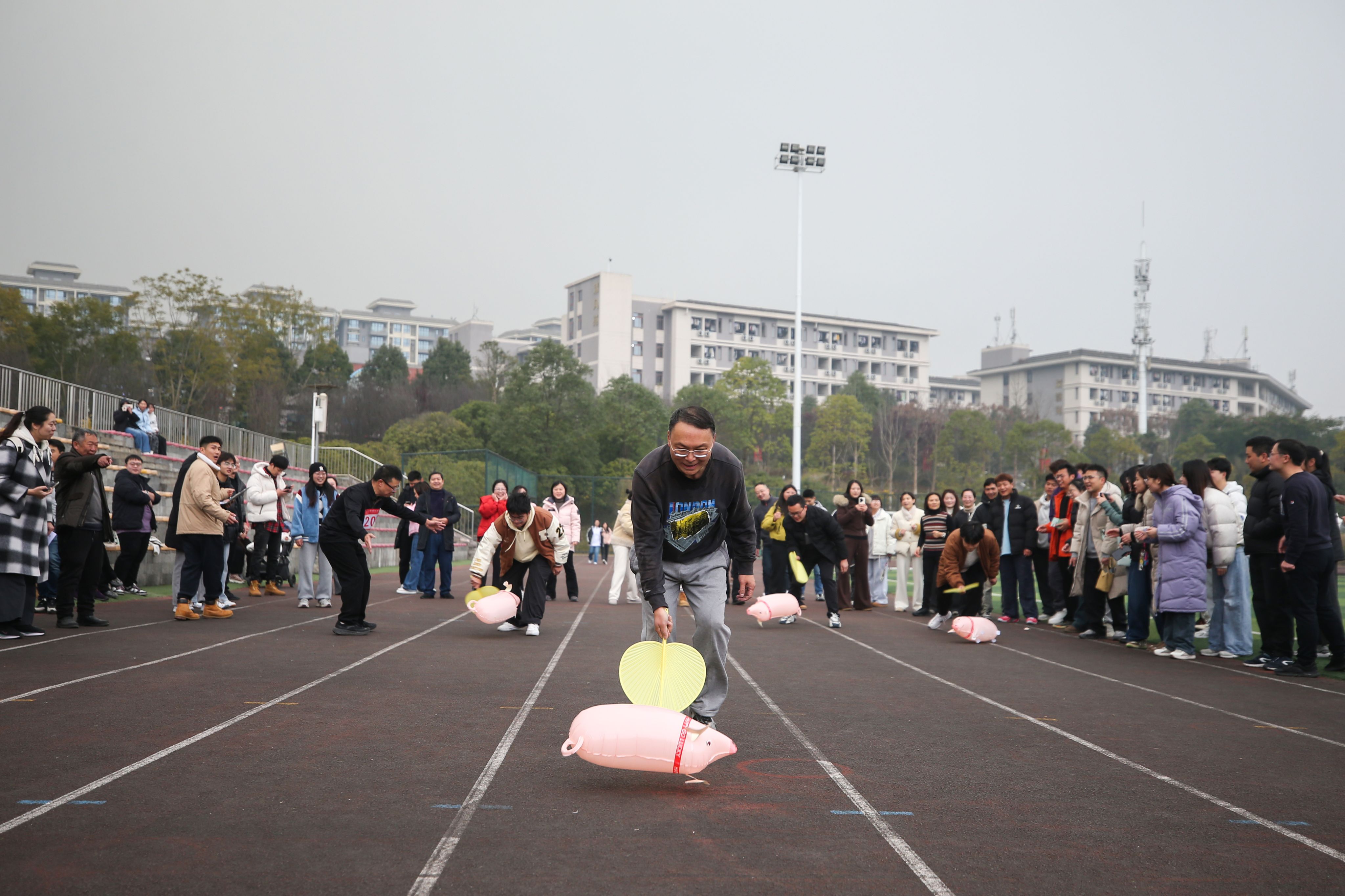 趣味运动会上,赶猪接力、毛毛虫竞速、400米滚铁环接力、八人九足、集体跳绳等项目轮番上阵。各代表队团结协作、奋勇争先,现场欢呼声与助威声不绝于耳,在轻松愉快的氛围中展现出良好的体育风貌与团队精神。