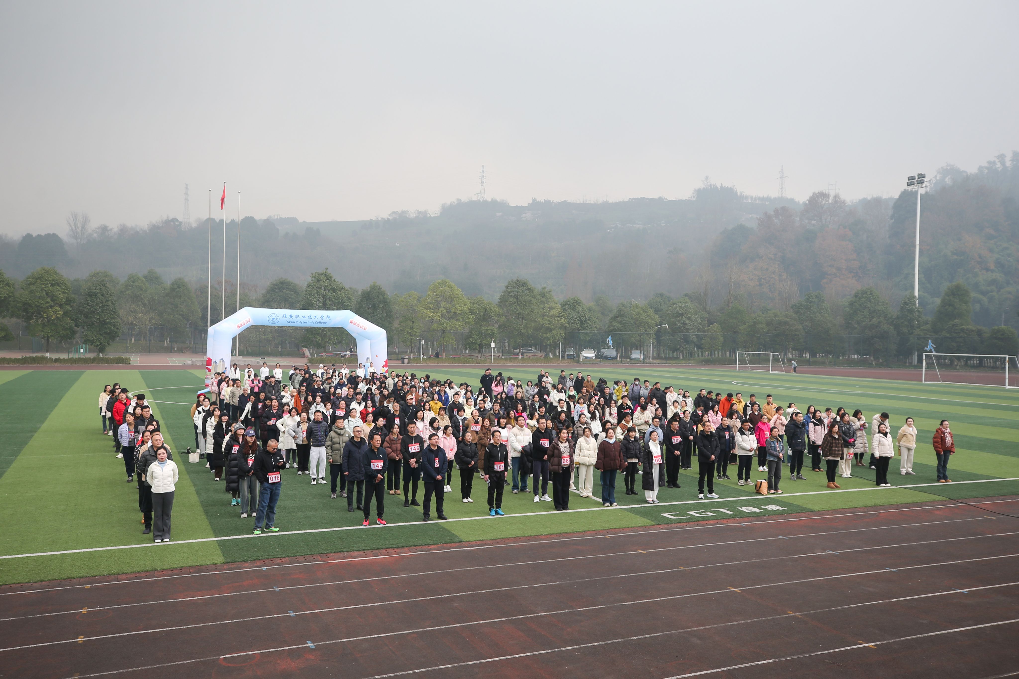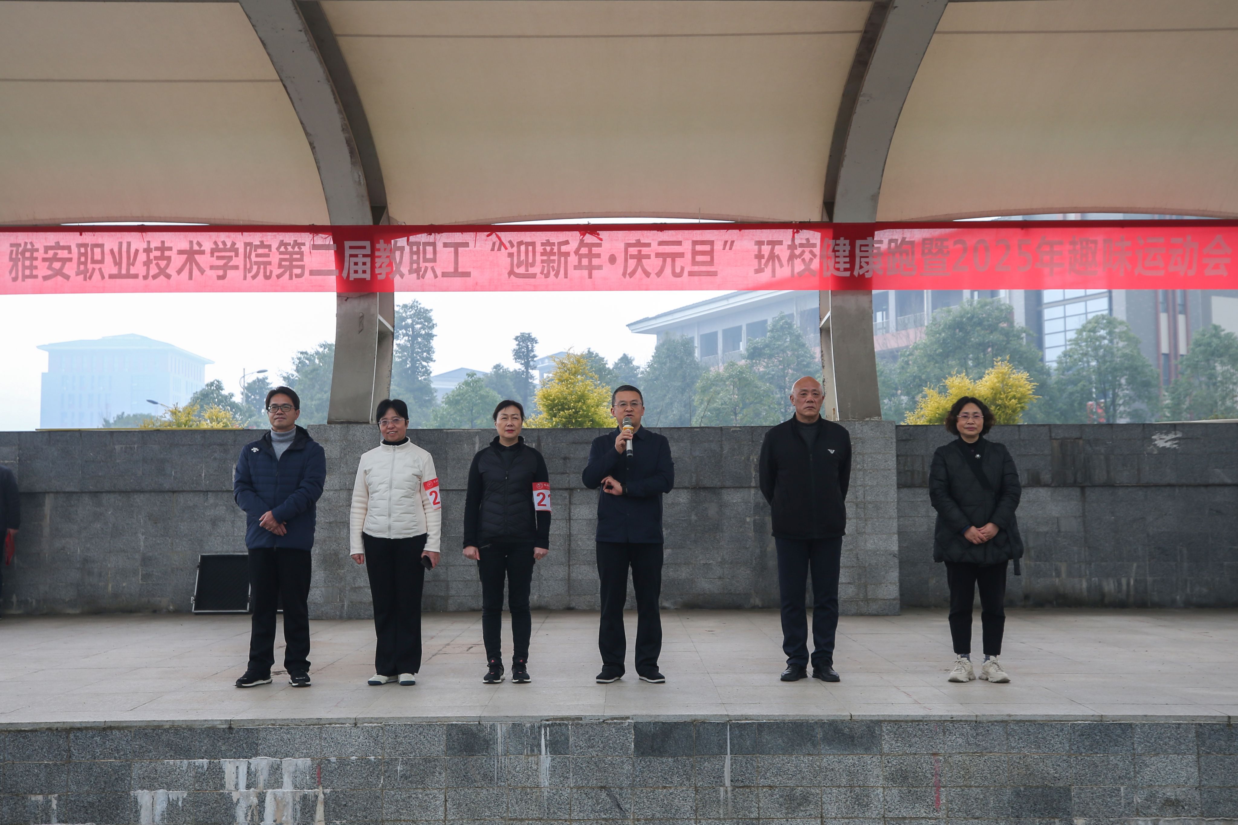 300余名教职工组成的12支代表队在庄严的国歌声肃立操场,黄诚校长代表学校党政向广大教职工致以亲切的新年的问候,并宣布:“雅安职业技术学院第二届教职工‘迎新年·庆元旦’环校健康跑暨趣味运动会开幕!”