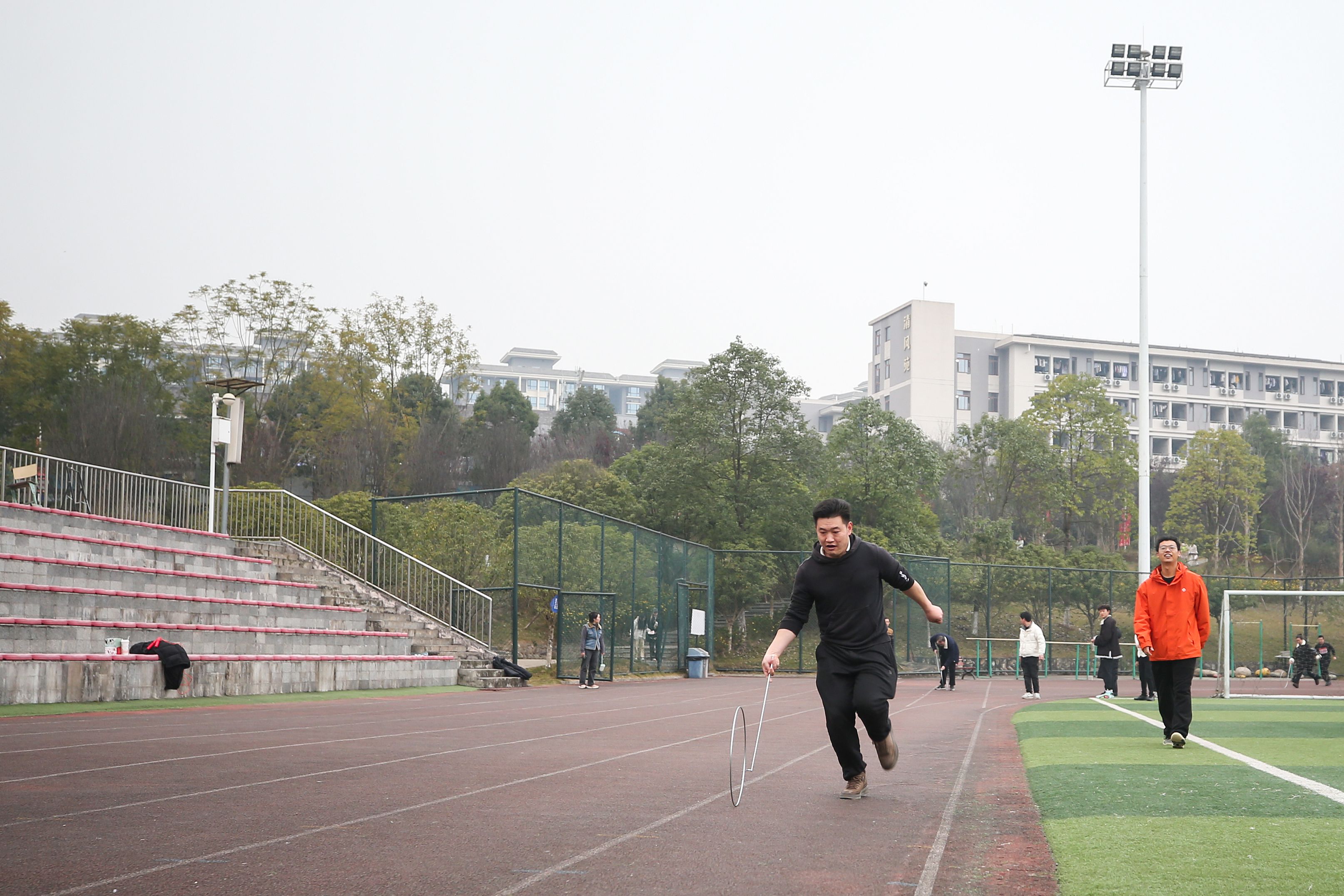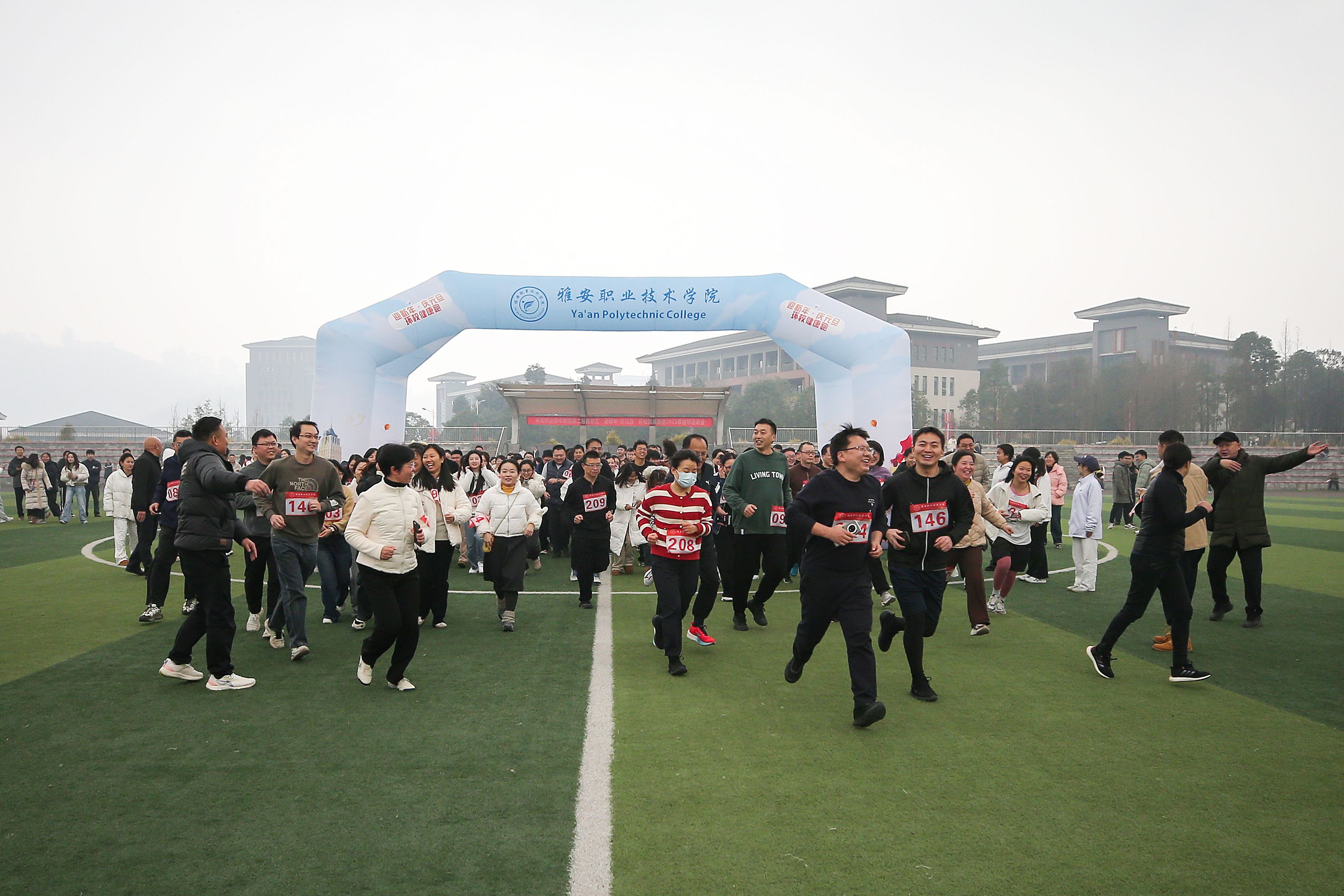 运动员们在欢快的音乐声中充分热身后,随着樊正康、陈冬冬两位校领导的发令枪响,210余名运动员精神抖擞地踏上环校跑道,在优美的校园中快乐奔跑,以健康昂扬的姿态喜迎新年到来。